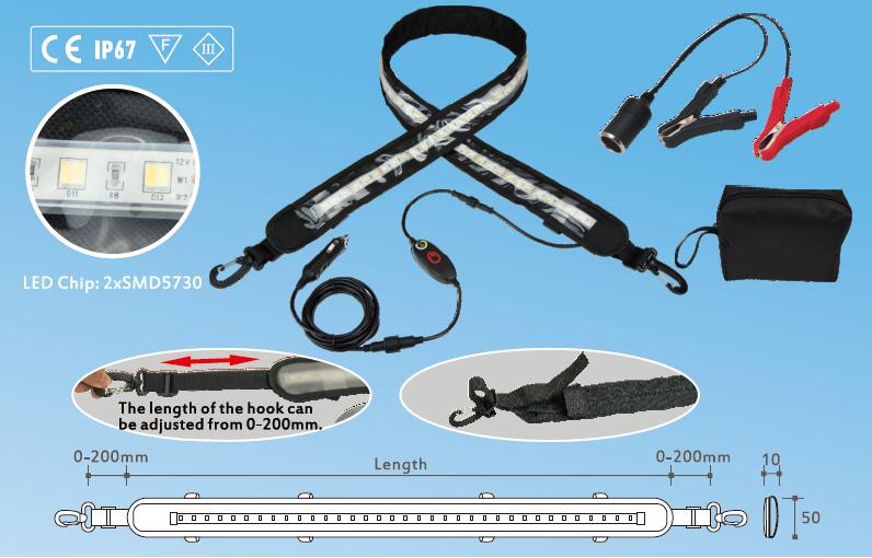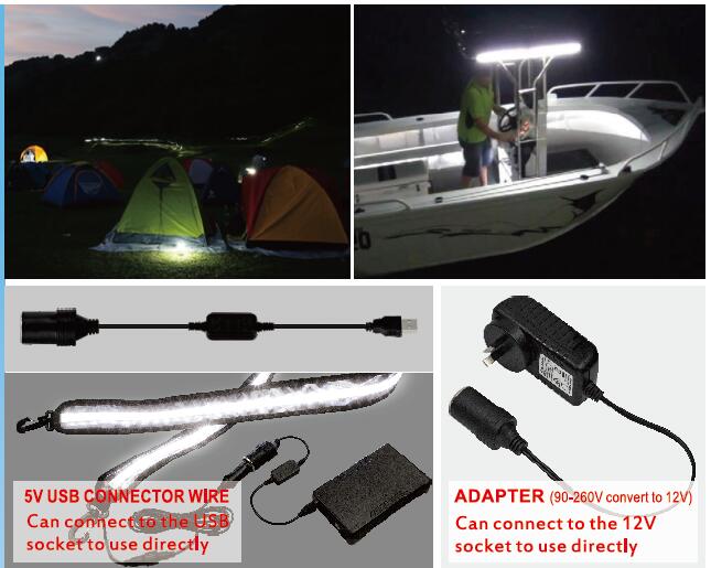 1. Length=1200 MM . 2. Provide the convenience for the wilderness illumination. 3. The CCT can be adjustable from 2700K - 6000K automatically. 4. Use the spcial design control, can convert the CCT from 2700K - 6000K easliy and also Can be dimmer from 10%-100%. 5. Cigarette connector plus 5.5 meter cable to connect to your vehicle. 6. With a cigarette lighter socket and clip, then can connect to the vehicle battery to use directly. 7. Easy folding structure for convenient package and storage. 8. Velcro wraps, hooks at the ends to allow for your easy installation. 9. Use the white LED chip, then can replace the T8 tube to use. 10. IP67 waterproof can resistant to water, dust and moisture ingress. 11. Totally portable 12. The length of the hook can be adjustable.