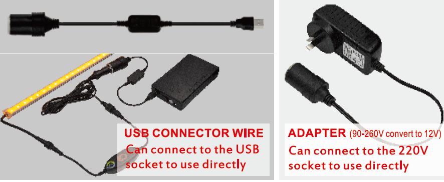 7. The led bar can be linkable. 8. The 36W 12VDC led adpater include. Specification: Input: 90-260VAC 50/60Hz, Output: 12VDC 3A, 36W, 1.5 meters wire, CE TUV SAA Rohs certification. 9. Can connect to the USB socket to work to use the USB Connector wire and Can connect to the 220V to use the Adapter.