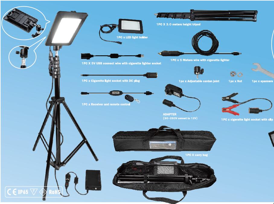 Specification: Input: 90-260VAC 50/60Hz, Output: 12VDC 3A, 36W, 1.5 meters wire, CE TUV SAA Rohs certification. 6. IP65 waterproof can resistant to water, dust and moisture ingress. 10. Totally portable 11. 2 years warranty. 12. Inner box: 650X125X135 MM 13. Outbox size:680X450X320mm, 6pcs / ctns, 12.8kg/ctns ◆ Accessori 1. 1pc x 3 meters height tripod 2. 1pc x 18W Light holder 3. 1pc x 5 meters connector wire with the cigaratte lightter 4. 1pc x USB connect wire with the cigaratte lighter socket 5. 1pc x 5.5X2.1 DC plug with the cigaratte lighter socket 6. 1pc x Adjustable joint 7. 8pcs x clip with the cigaratte lighter socket 8. 8pcs x Remote control 9. 8pcs x Receiver 10.1pc x nut 11.1pc x Spanners 12.1pc x 36W Adapter with the cigaratte lighter socket 13.1pc x big carry bag