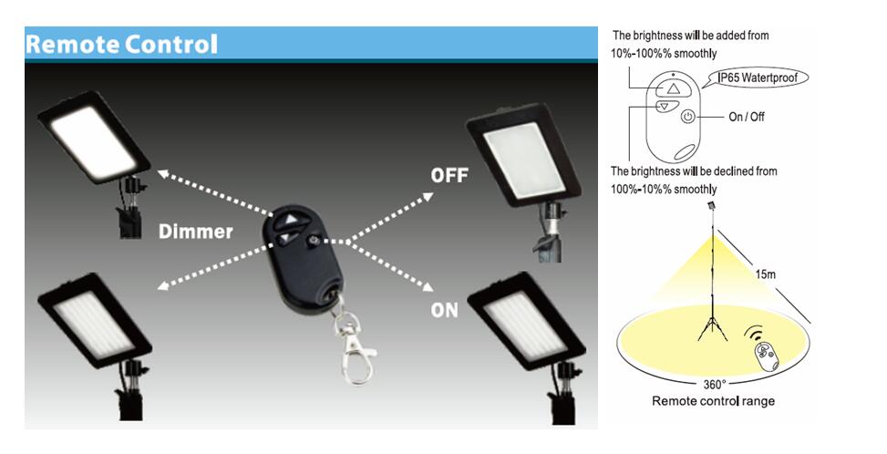 1. Provide the convenience for the wilderness illumination. 2. Can be dimmer from 10%-100%. 3. The height can be adjustable from 600MM to 3000MM. 4. With the remote control and receiver, the distance of the remote control will be 50 meters.